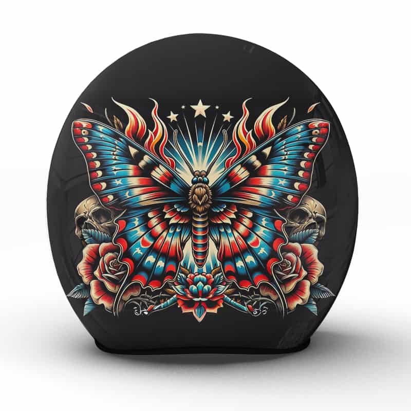 Der „Butterfly“-Motorradhelm ist ein farbenfrohes Fest der Verwandlung und der Schönheit des Lebens. Das prachtvolle Motiv eines Schmetterlings, dessen Flügel sich in einer kaleidoskopischen Pracht entfalten, repräsentiert die Freiheit und die elegante Veränderung, die das Biker-Dasein begleiten. Die Totenköpfe und Rosen am Rand symbolisieren die Verbindung zwischen Leben und Tod und die ewige Erneuerung. Jedes Detail dieses Helms, das in unserer Manufaktur sorgfältig handgefertigt wurde, erzählt von der Reise der Selbstentdeckung und der Freude am Flug durch das unbekannte Terrain des Lebens.