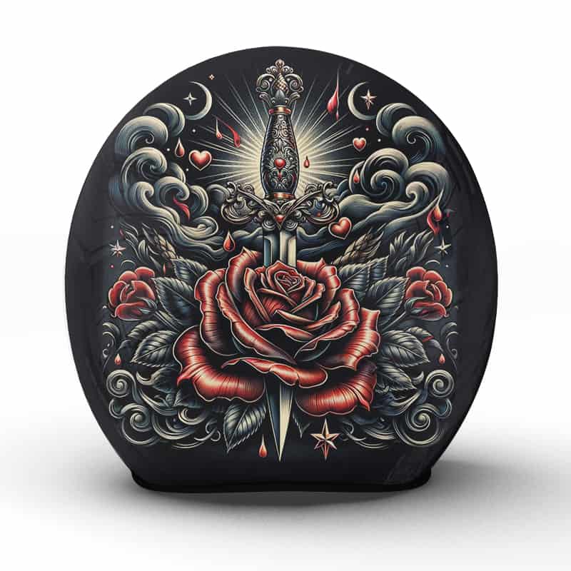 Der „Cunning“-Motorradhelm ist ein wahres Kunstwerk, das die subtile Macht der Verführung und Intelligenz symbolisiert. Zentriert um eine majestätische Rose das Herzstück dieses Meisterwerks fließen kunstvolle Verzierungen und Elemente wie das schimmernde Schwert, das sowohl Weisheit als auch Stärke verkörpert. Eingefasst von mystischen Wolken und lieblichen Herzchen, wird dieses Motiv zum Spiegel der Seele des Fahrers, der durch List und Tücke seinen Weg bahnt. In unserer Manufaktur mit Liebe zum Detail handgefertigt, inspiriert dieser Helm zu listiger Vorsicht und sinnlicher Anmut auf jeder Fahrt.