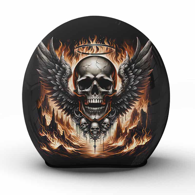 Der „Descending“ Motorradhelm ist ein wahres Kunstwerk aus unserer Manufaktur, das mit einem kraftvollen Motiv die Dualität von Aufstieg und Fall darstellt. Zentral ist ein Schädel, umgeben von Flammen und majestätischen Flügeln, was an einen gefallenen Engel erinnern könnte. Dieses Bild ruft bei dem Träger ein Gefühl von Freiheit und der Vergänglichkeit des Moments hervor, ein stetes Spiel zwischen dem Himmel und der irdischen Existenz.