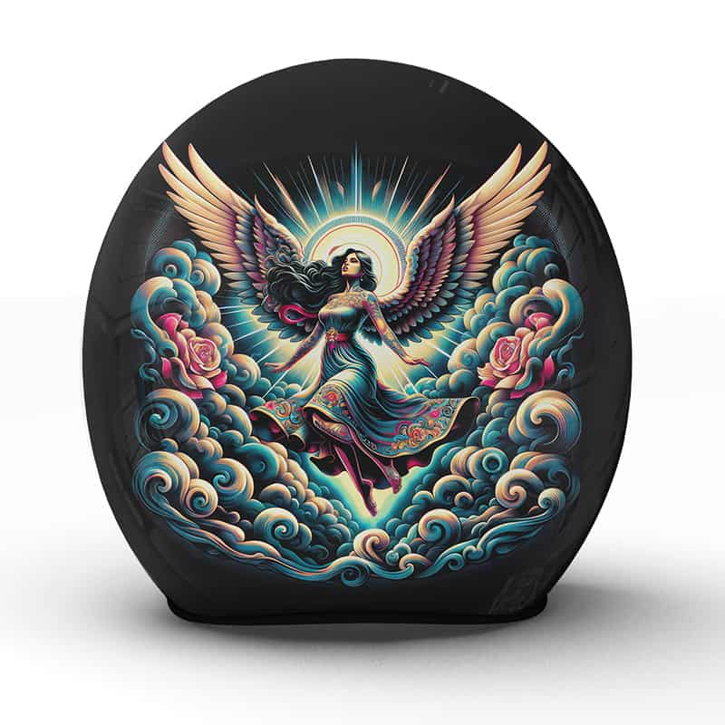 Der „Divine“ Motorradhelm ist ein Meisterwerk aus unserer Meisterwerkstatt, das mit seinem himmlischen Motiv den Geist hebt und den Blick auf das Erhabene lenkt. Diese göttliche Darstellung einer Engelsgestalt, umgeben von leuchtenden Rosen und schimmernden Wolken, vermittelt ein Gefühl der Freiheit und des Schutzes, als würde eine höhere Macht über den Wegen des Fahrers wachen.