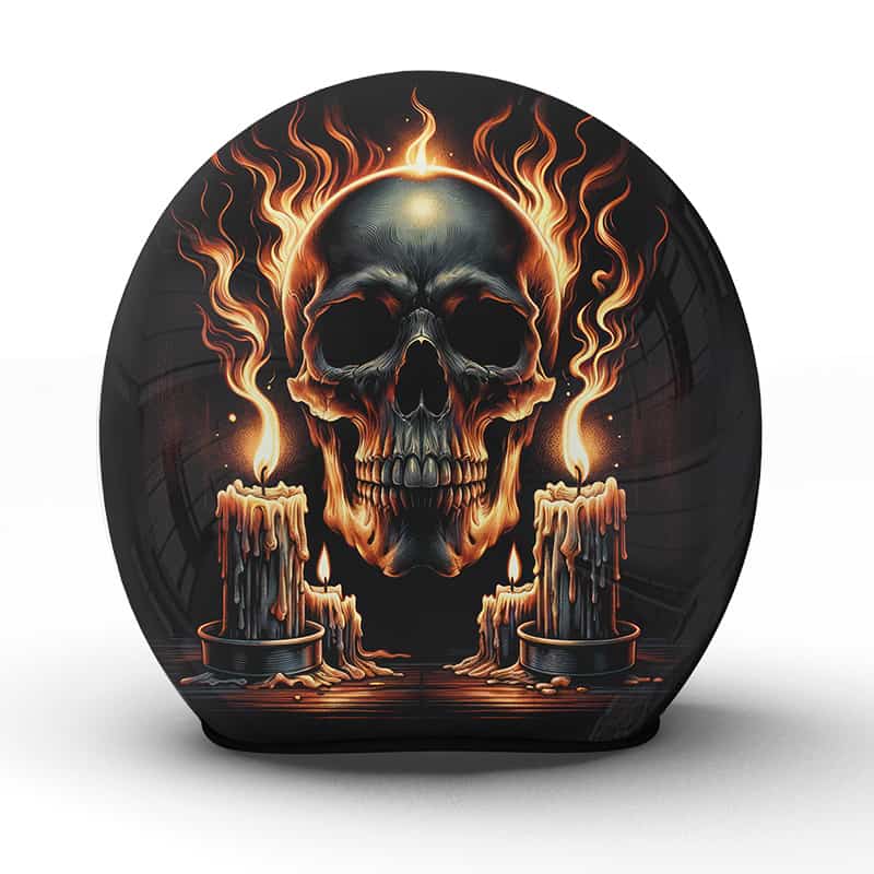 Der Motorradhelm „Macabre“ ist eine düstere Ode an die Endlichkeit des Lebens, handgefertigt in unserer Manufaktur. Das Motiv, ein tiefschwarzer Schädel, umgeben von lebhaften Flammen und schmelzenden Kerzen, erinnert an die Vergänglichkeit und die intensive Natur unserer Existenz.