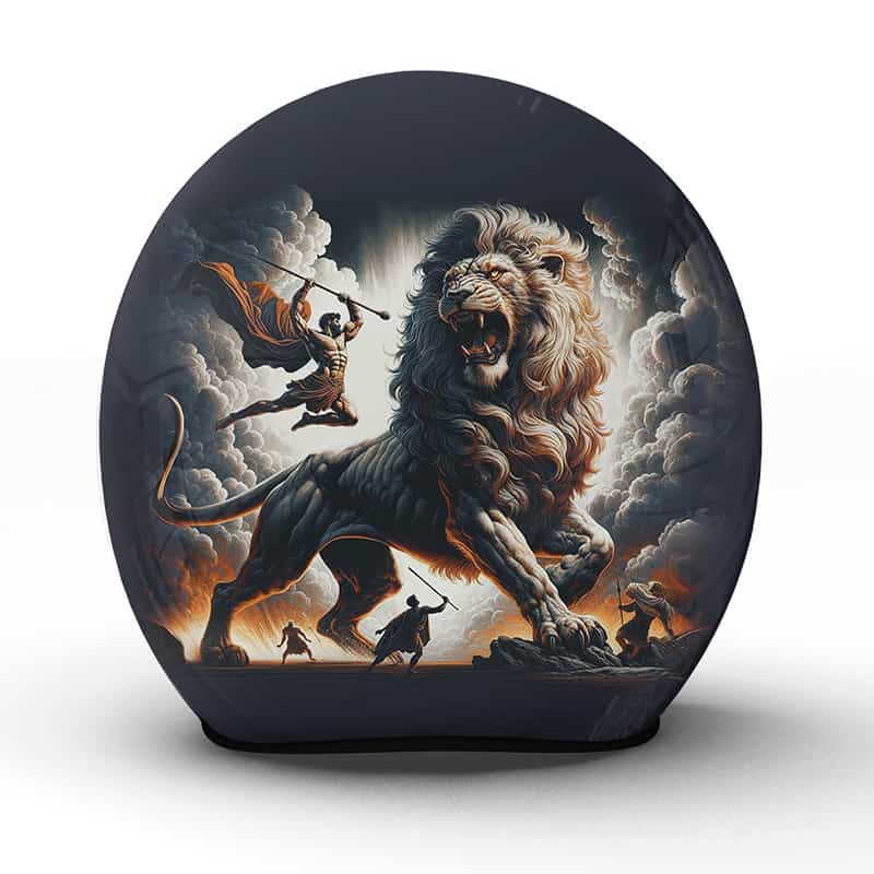 Der „Nemean“ Helm ist eine Huldigung an die unerschütterliche Tapferkeit und die epische Stärke, die in der Seele eines jeden Bikers wohnt. Das Motiv, inspiriert von der mythischen Nemeischen Löwe, steht für Mut und Unbesiegbarkeit, die im Herzen derer lodern, die sich auf die Straße wagen. Das Bild eines heroischen Kampfes unter dramatischen Wolken verleiht dem Träger ein Gefühl von Legende und Geschichte und wird in unserer Manufaktur mit meisterlicher Präzision und Liebe zum Detail zum Leben erweckt.