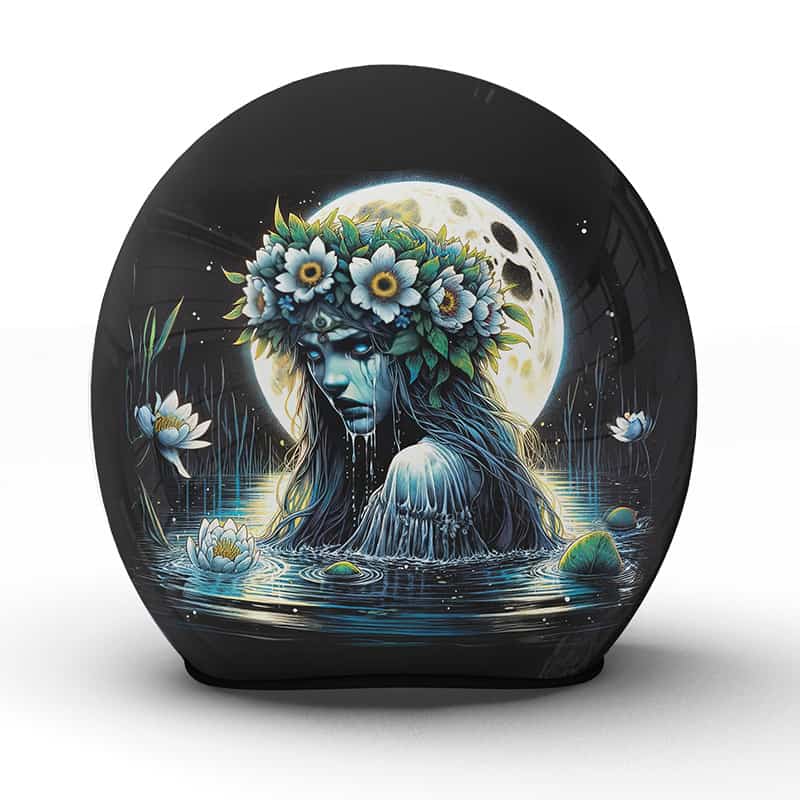 Der „Rusalka“ Helm ist ein wahres Juwel der Handwerkskunst aus unserer Manufaktur, der die mystische Schönheit einer Wassernymphe gegen das strahlende Licht des Mondes einfängt. Dieses Motiv entführt den Betrachter in eine Welt der Poesie und Ruhe, während er durch die Nacht fährt. Die Verbindung von Wasser und Flora, gekrönt von einem strahlenden Mond, vermittelt ein Gefühl von Frieden und Harmonie, das die Essenz der Natur widerspiegelt. Es lädt den Fahrer ein, sich mit der Ruhe der Natur zu vereinen und auf jeder Fahrt Gelassenheit zu empfinden.
