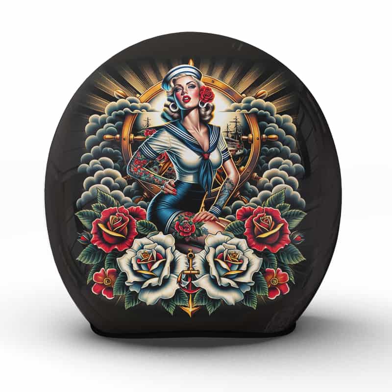 Der „Sailorette“-Motorradhelm ist eine Ode an die romantischen Geschichten der Seefahrt und die Eleganz des maritimen Lebens. Im Zentrum dieses kunstvollen Werkes steht eine betörende Seemannsbraut, gekleidet in traditioneller Matrosenkleidung, die mutig das Steuerrad in den unruhigen Gewässern des Lebens hält. Umgeben von üppigen Rosen und stolzen Ankern, strahlt das Motiv eine Aura von Abenteuerlust und femininer Stärke aus. Dieser Helm, der in unserer Manufaktur mit größter Sorgfalt und Präzision handgefertigt wurde, verkörpert die Sehnsucht nach Freiheit auf offener See und ruft beim Fahrer ein Gefühl von nostalgischer Sehnsucht und ungebändigter Hoffnung hervor.