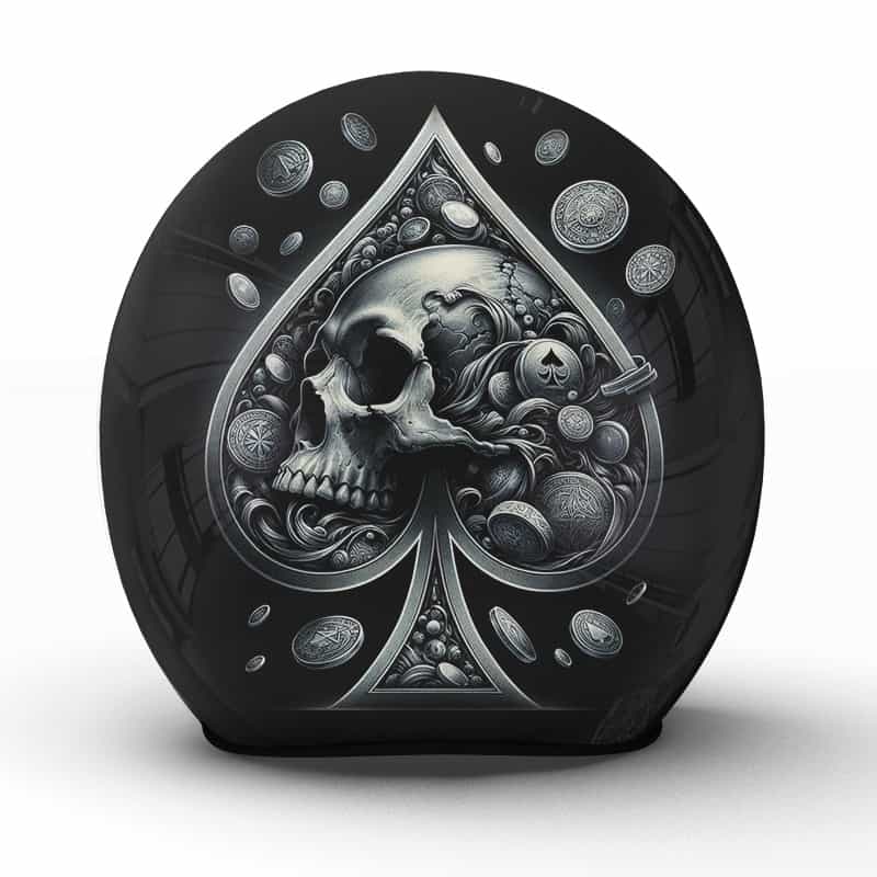 Der „Spade“ Helm ist ein kunstvolles Prachtstück, erschaffen in unserer Manufaktur, das die Raffinesse und das waghalsige Spiel des Lebens widerspiegelt. Das sorgfältig gearbeitete Motiv zeigt einen Schädel, umgeben von spielkartenähnlichen Verzierungen und Münzen Symbole für das Glück und die Vergänglichkeit, die jedem Motorradfahrer auf seinen Fahrten begegnen. Dieser Helm, geboren aus reiner Handwerkskunst, erinnert den Biker daran, dass jede Fahrt ein Wagnis ist, das Mut und die Bereitschaft erfordert, das Schicksal in die eigenen Hände zu nehmen. Er spricht die tiefen, oft unergründlichen Emotionen an, die auf der Straße erlebt werden: ein Mix aus Adrenalin, Respekt vor der Zeit und dem Schicksal selbst.