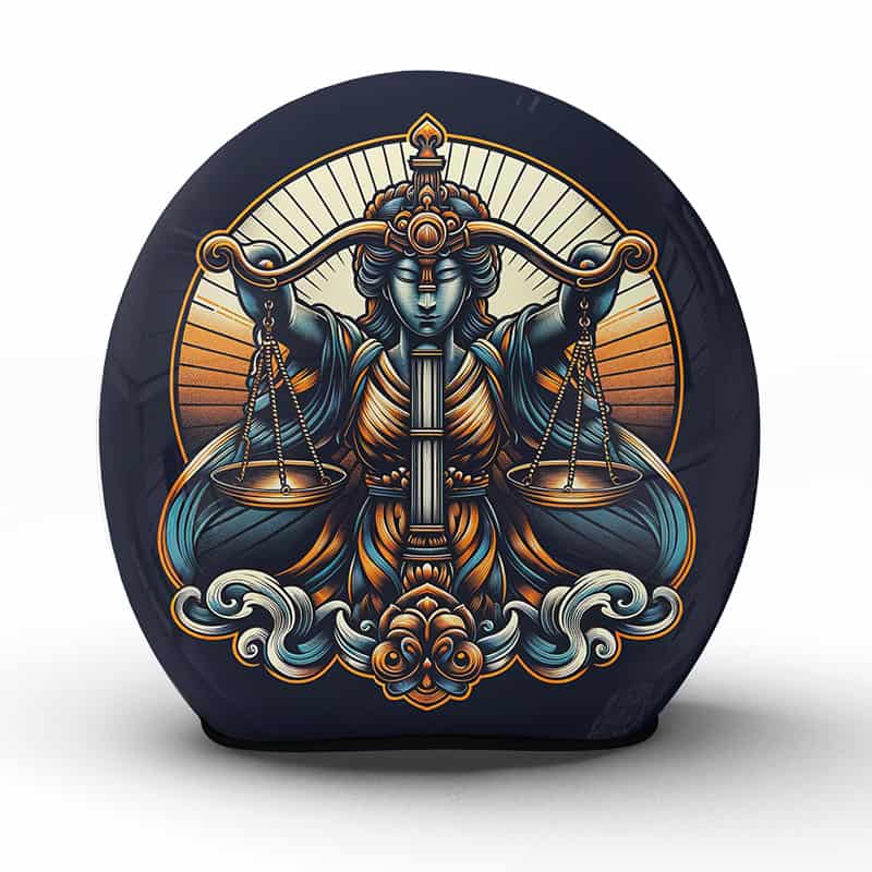 Der „Tenzaru-Kawa“ Helm ist eine meisterhafte Darstellung der Göttin der Gerechtigkeit, eingebettet in ein tiefes Meer aus Wellen und Harmonie. Dieses Motiv symbolisiert die Ausgewogenheit und den Respekt vor dem Gesetz der Straße, das jeder Biker tief in seinem Herzen trägt.