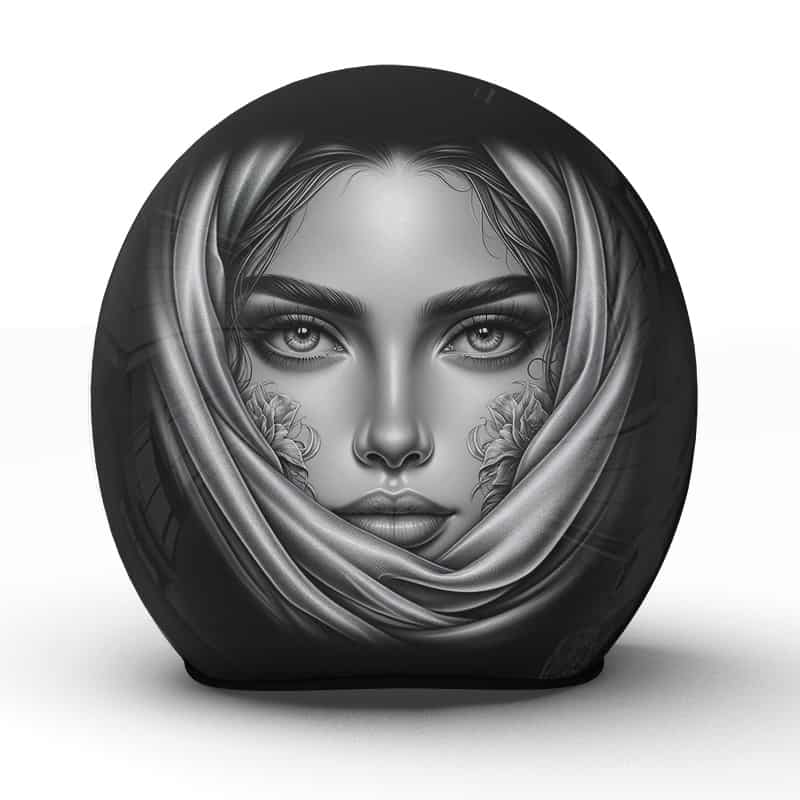 Der „Women“ Motorradhelm verkörpert die Schönheit und das Mysterium des Weiblichen in einem Porträt, das zugleich kraftvoll und sanft ist. Hergestellt in unserer Manufaktur, präsentiert dieses Design eine Frauengestalt, deren Blick tief und erzählend ist, umhüllt von einem zarten Schleier, der durch kunstvoll gearbeitete Blumen akzentuiert wird. Die Detailtiefe und der feinsinnige Ausdruck sind ein Zeugnis echter Handwerkskunst. Dieses Motiv spricht die tiefe Wertschätzung und Bewunderung für die geheimnisvolle Seite des Lebens aus, eine Ode an die Motorradfahrer, die die subtilen Nuancen des Daseins ehren und die Weisheit und Intuition des Femininen in ihr Fahrerlebnis integrieren möchten.